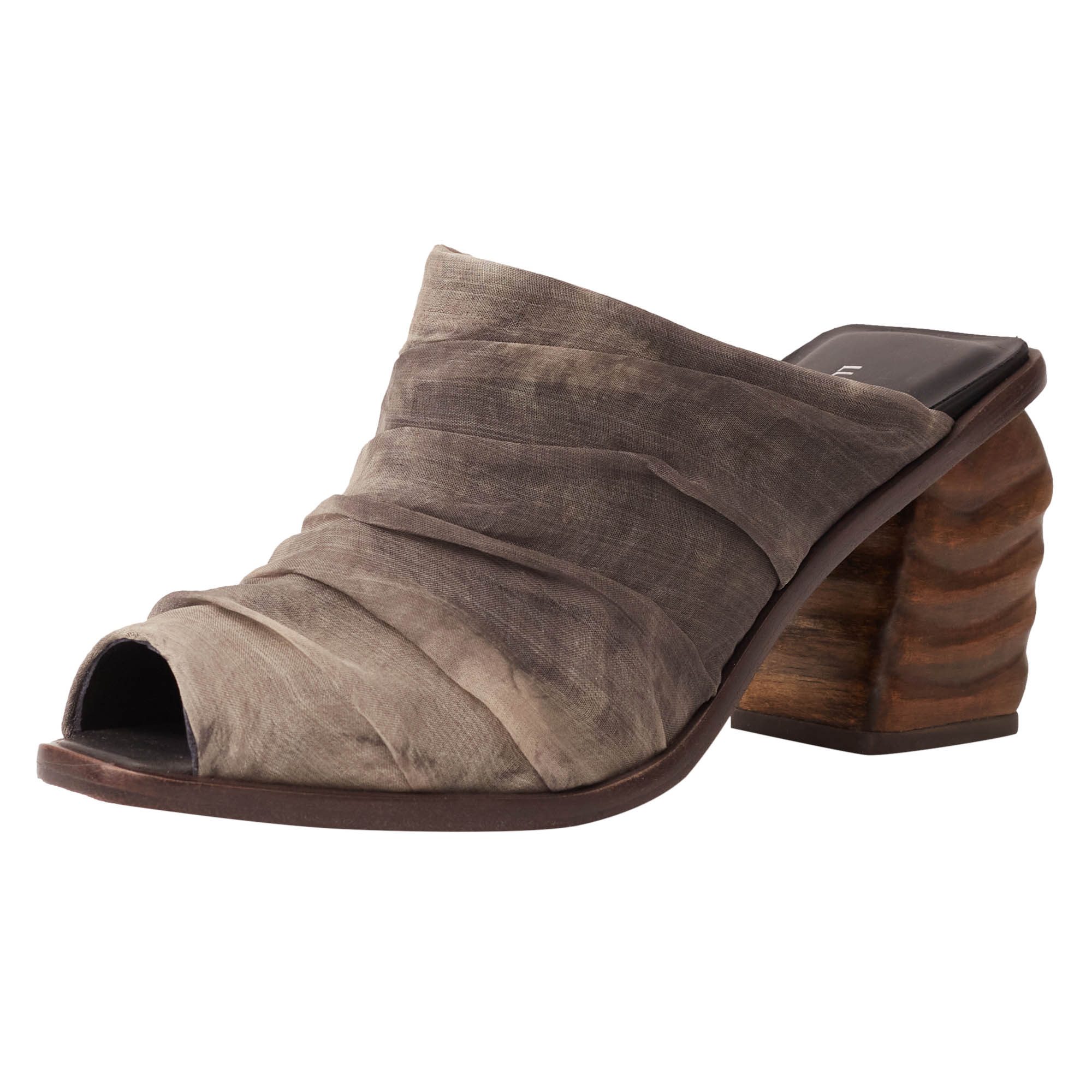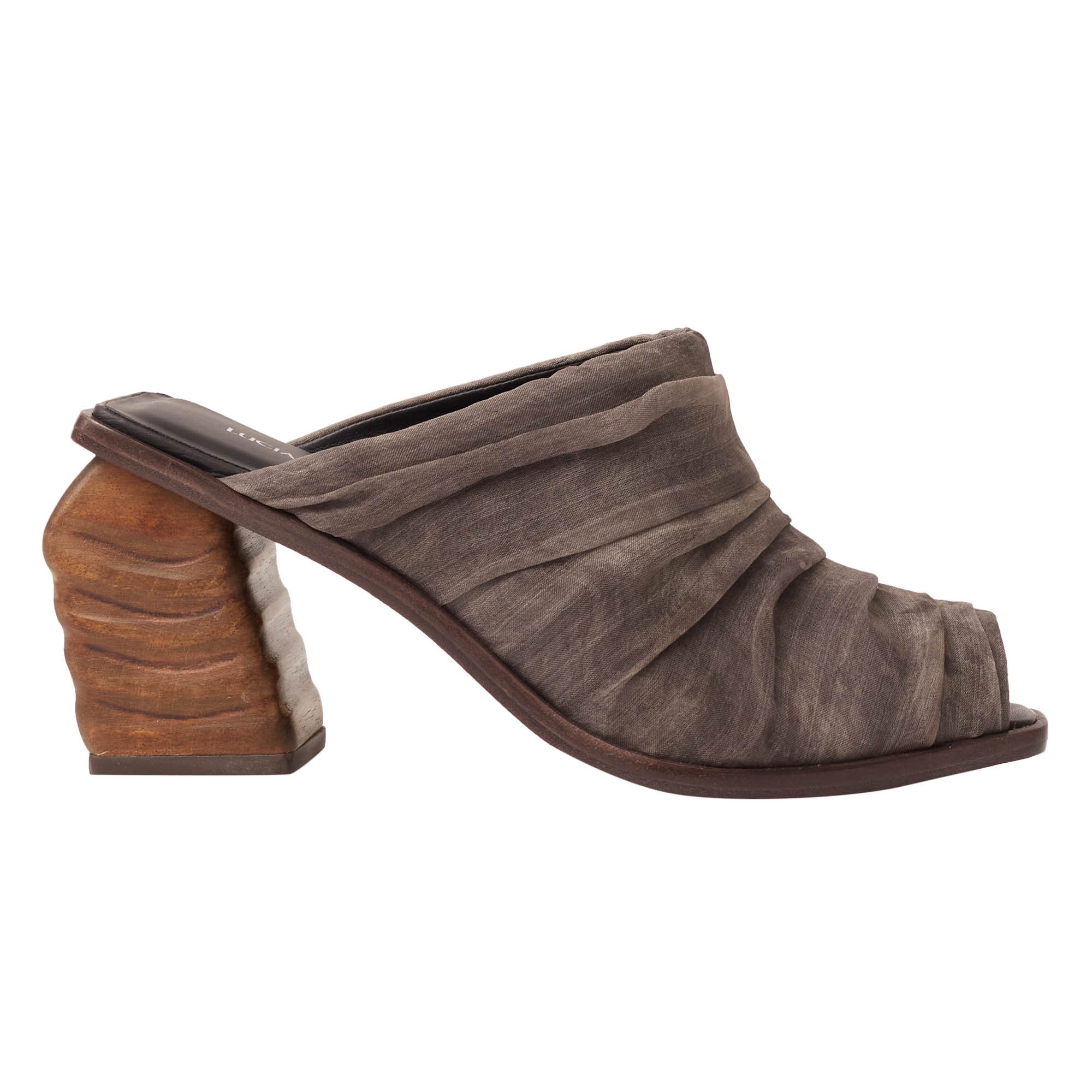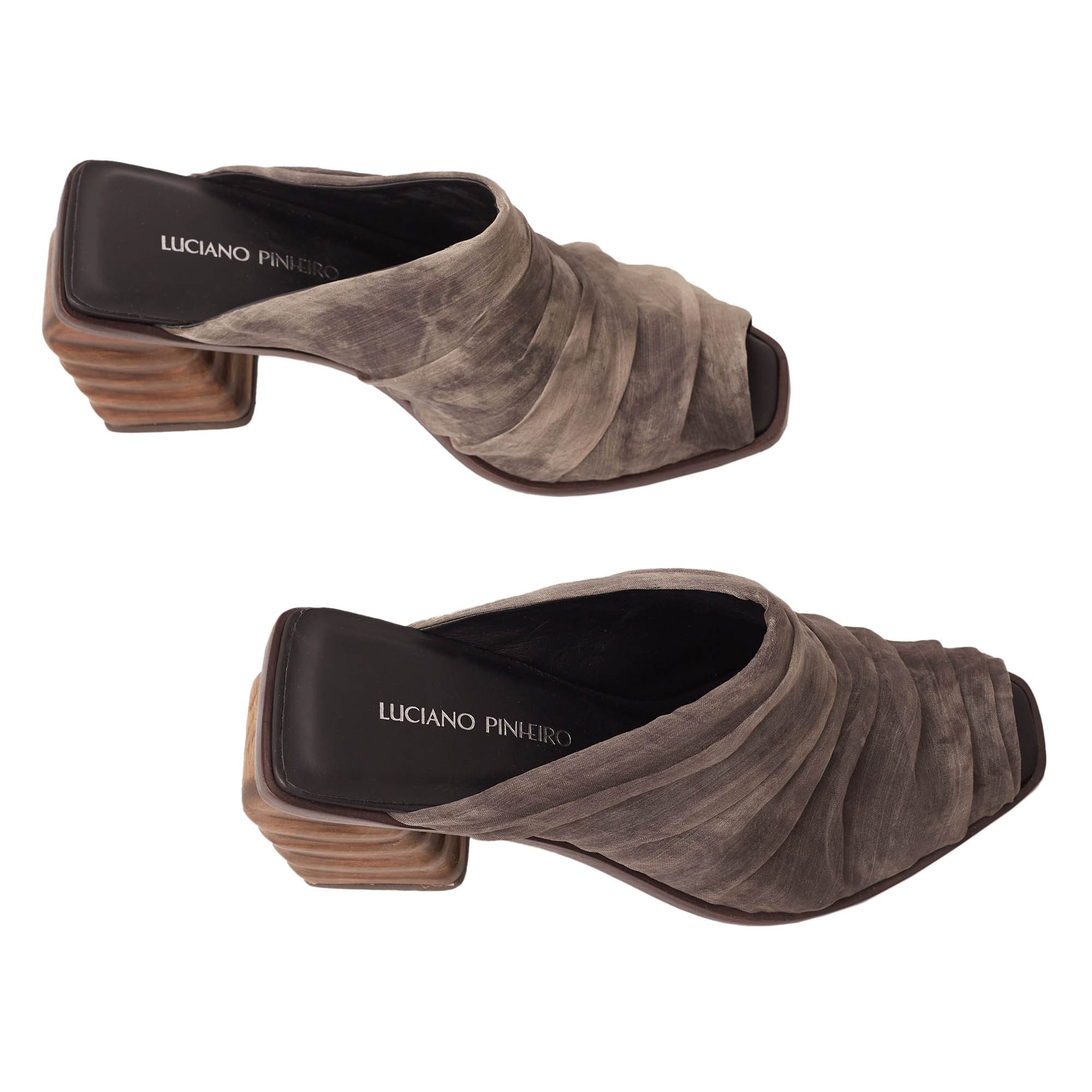 O Mule Areia é uma ode à natureza. O design autoral exclusivo apresenta um salto robusto com formas orgânicas inspiradas na geometria das dunas de areia, criando uma escultura funcional. O cabedal drapeado, com seda orgânica e tingimento 100% natural (pigmentos vegetais de aroeira), celebra a sustentabilidade com a riqueza de cores. Uma peça statement para quem aprecia arte e luxo com história.